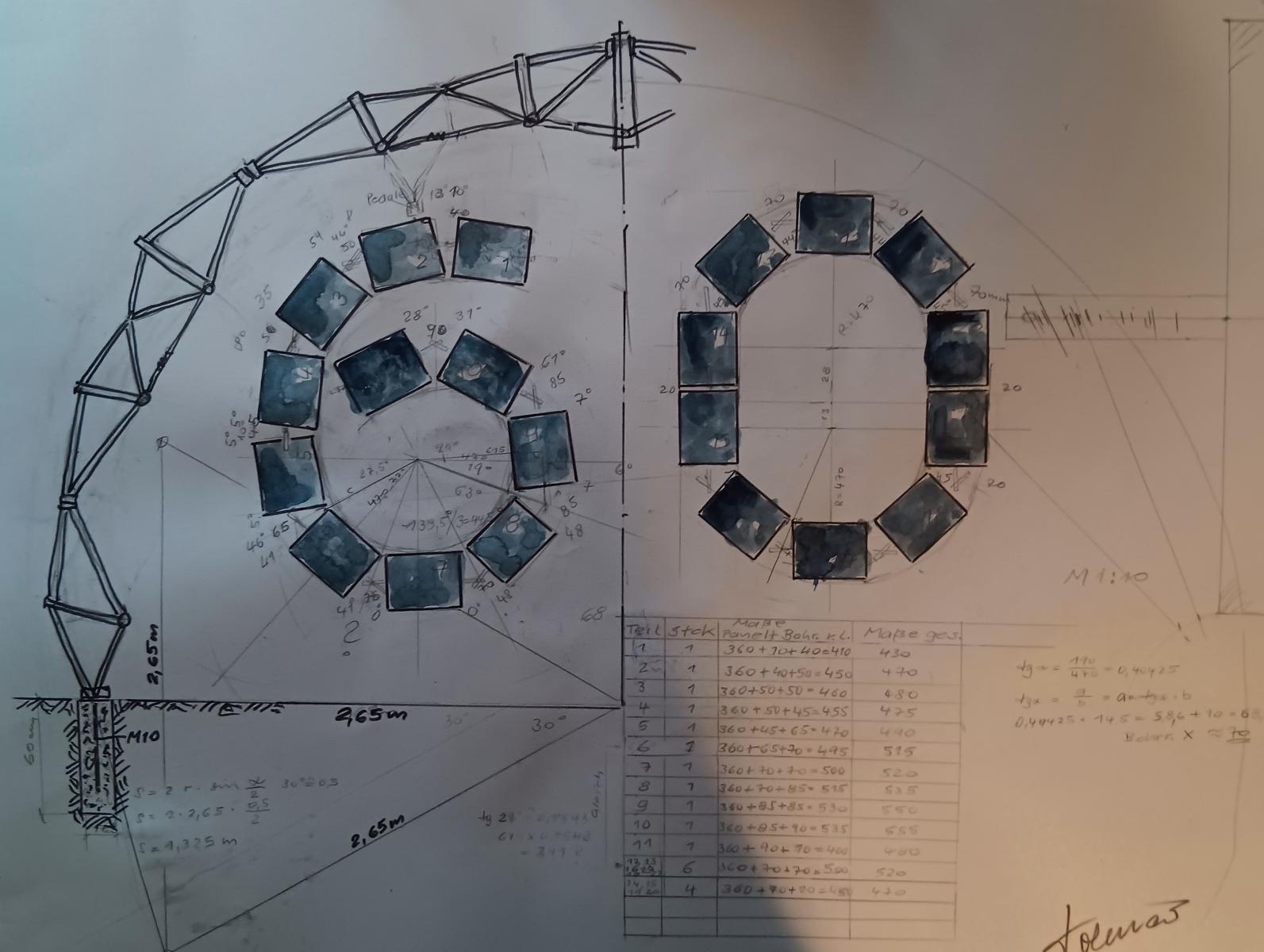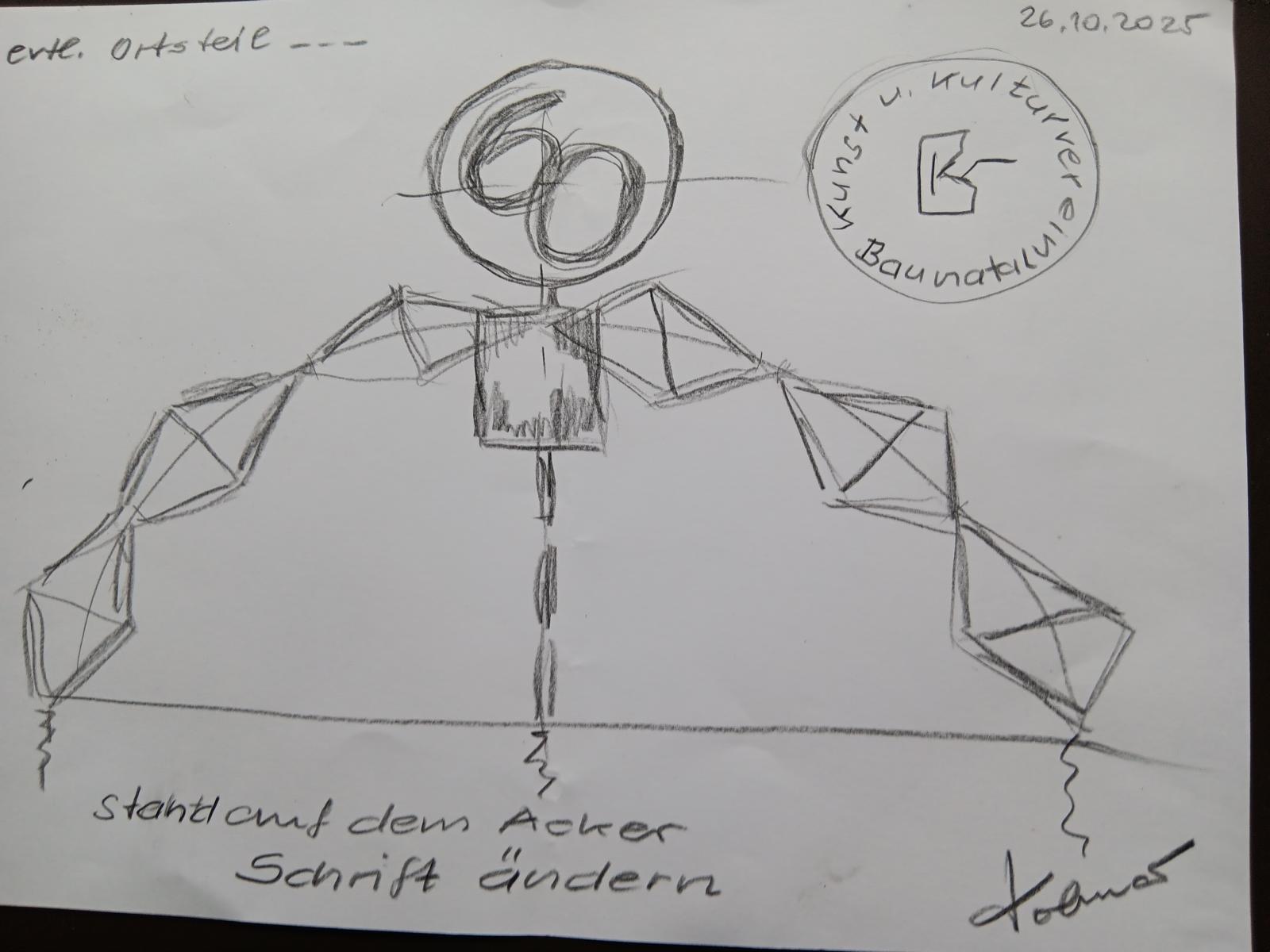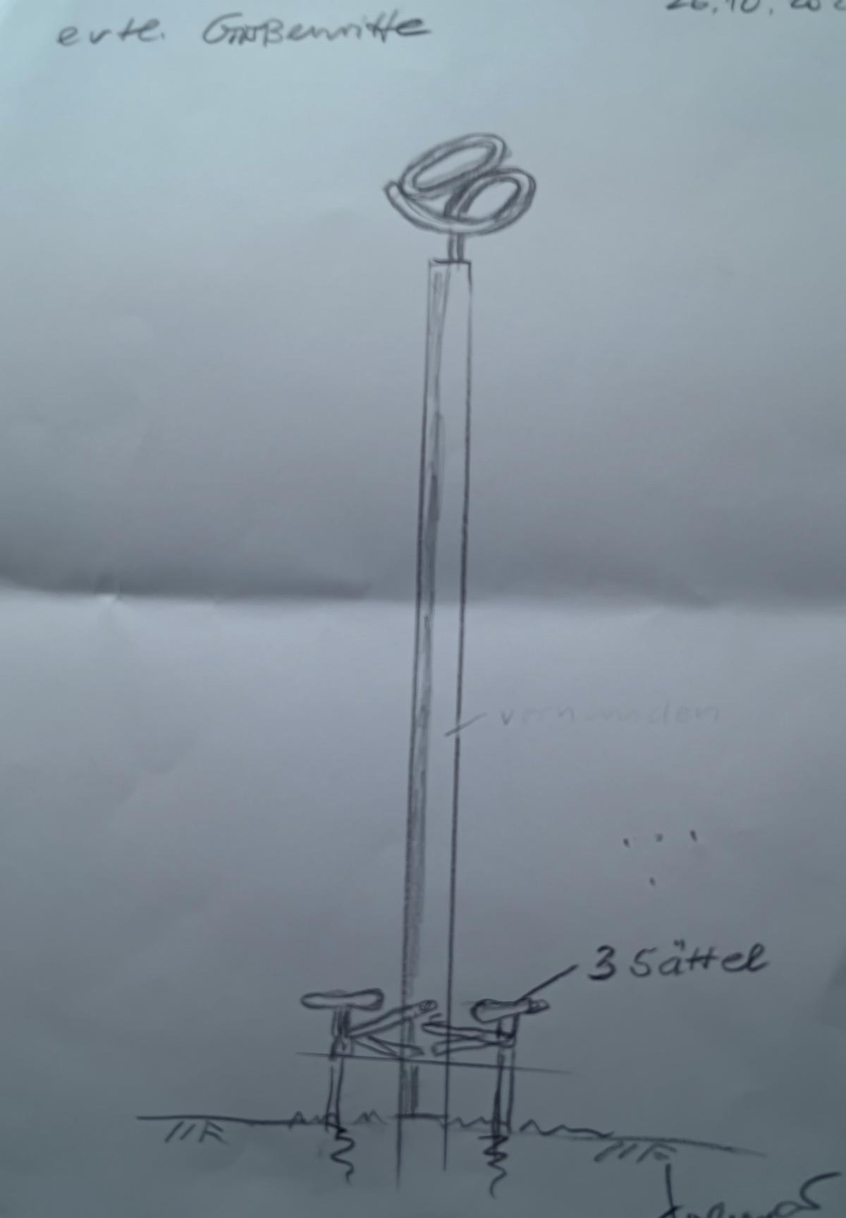 Für das 60. Jahre Jubiläum kann ich mir mit dem Kunst und Kulturverein den Bau von Skulpturen für die einzelnen Stadtteile gut vorstellen. Sie bestehen aus Gestellen aus Fahrradrahmen im Halbbogen. Eins, etwa 6m im Durchmesser und 3m Hoch. An diesem Gestell hängen eine 6 und eine 0 aus 21 Solarmodulen. Diese Module sind auf den Rückseiten verschieden bemalt und mit der Zahl 60. Der Kunst und Kulturverein unterstützt mit der Bemalung. Am Ende nächsten Jahres können die Module für einen Guten Zweck versteigert werden. Der Aufstellungsort könnte der Europaplatz sein und weitere Stadtteile. Skizzen 1.) Adler (siehe Home Page) 2.) Radler 3.) Goggel 4.) Springbrunnen (auf Europaplatz neu gestalten) 5.) Skulptur Großenritte Nord (Umänderung des Schildes auf 60 Jahre) 6.) Säule mit Fahrradsitzen. Die meisten mit Bewegung. Mit 12 Volt Solar Strom betrieben. |