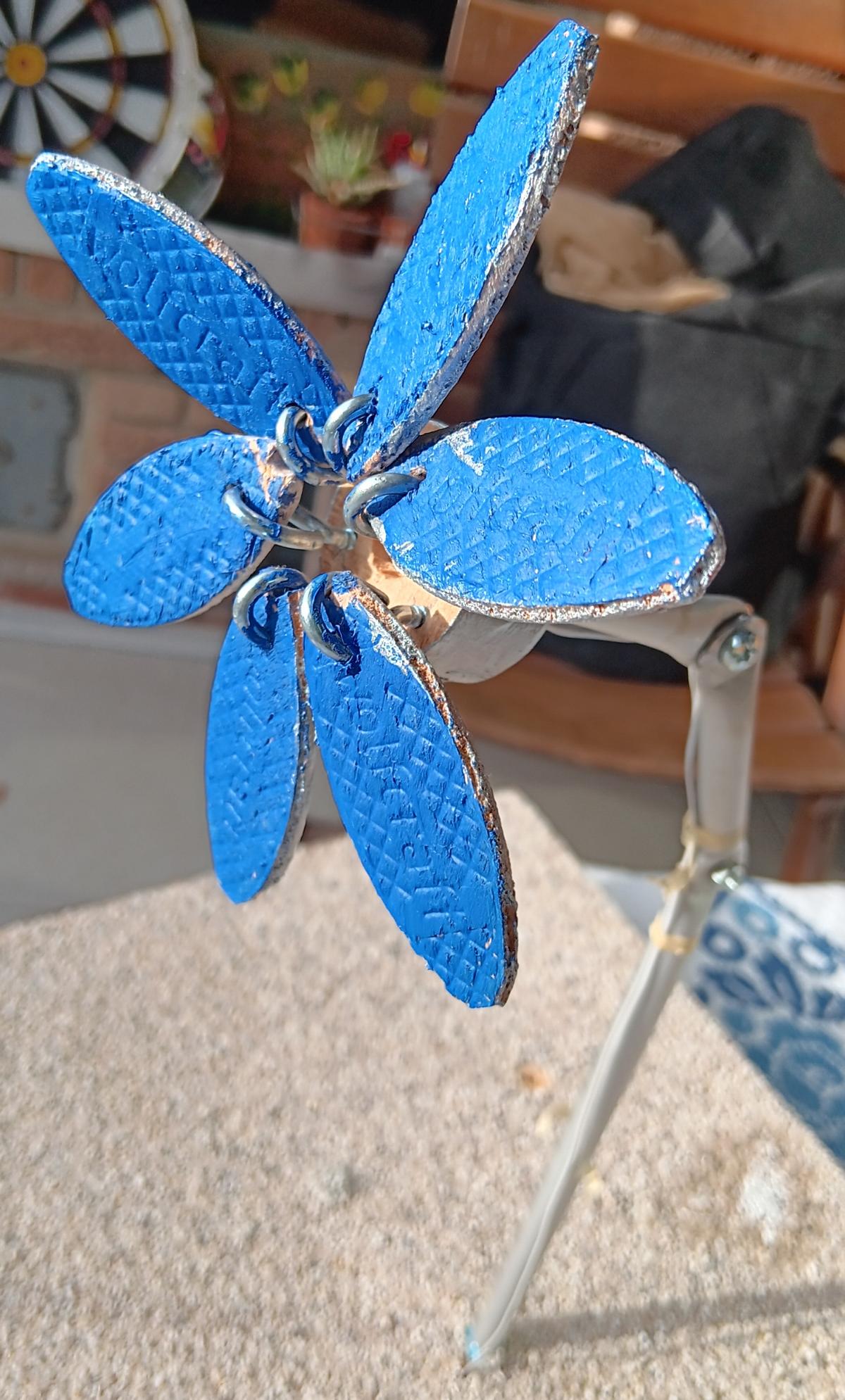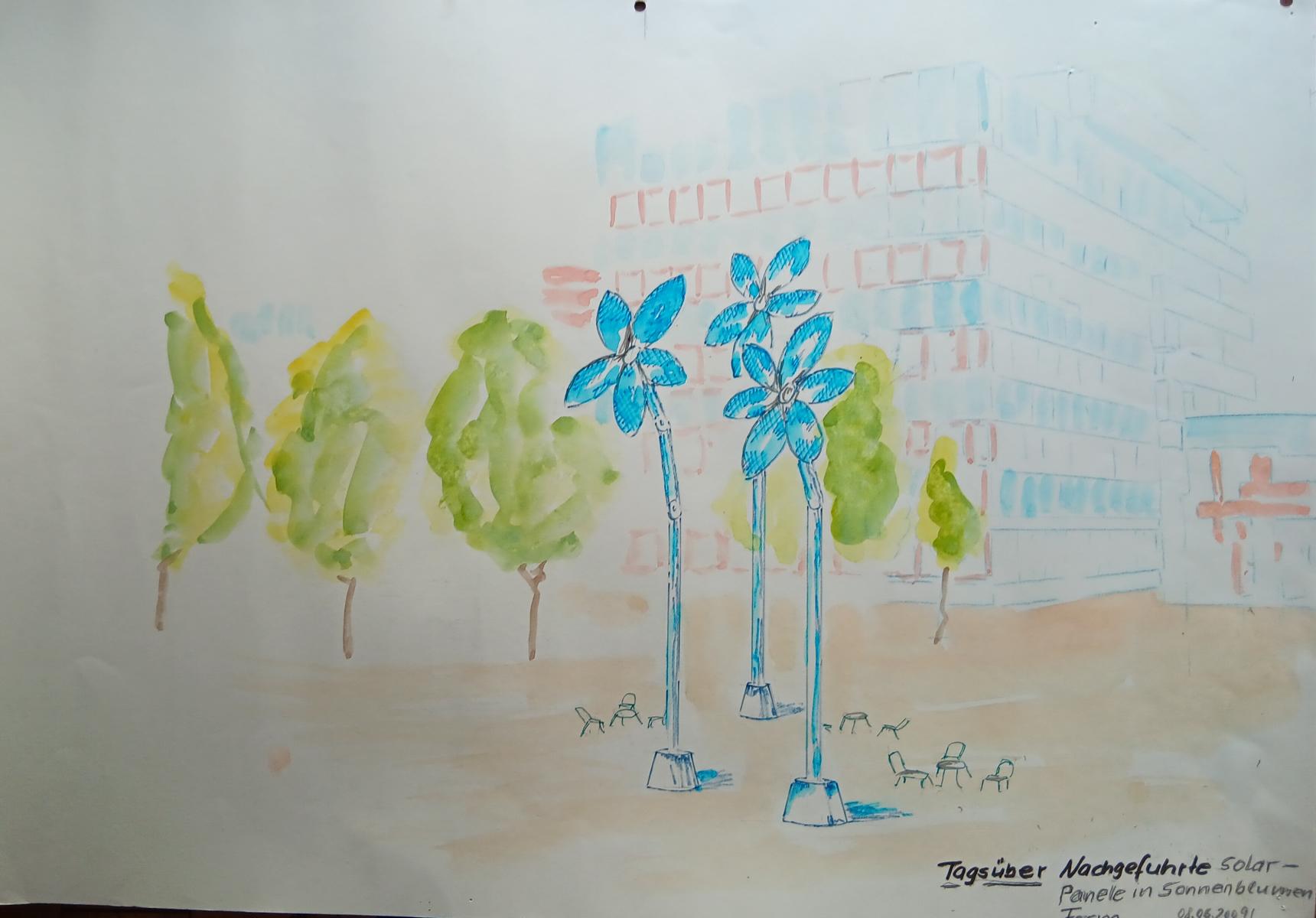 Die Sonnenblumenlampe hat die Fähigkeit sich der Sonne zuzuwenden und über den Tag nachzuführen, wie es durch die Nachführelektronik bei den Ständer Solarmodulen auch angewendet wird. Die Blütenblätter bestehen aus Solarmodulen, die Tagsüber der Sonne zugewandt mit dem Strom eine Batterie aufladen wird. Abends senkt sich das Gestell mit den Blütenblättern über eine Sitzgruppe und bildet eine Lampe. Über Nacht stellen sich die Blütenblätter wieder geöffnet in Richtung Osten. Das Gestell besteht aus Mehrkammern Markisenstangen, am Sockel drehbar mit Spindelmotore. Diese Installation bietet sich besonders als optische Attraktion in Innenstädten an.